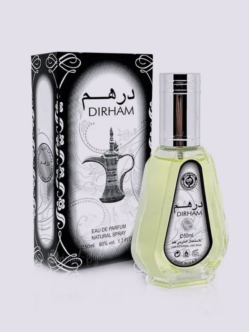 Dirham Eau De Parfum offers a refreshing burst of citrus and florals upon the first spray, making you feel revitalized. As the scent evolves, the floral heart of jasmine and rose provides a delicate yet sophisticated aura. The base of musk and woods gently grounds the fragrance, leaving a calming and lasting scent that's perfect for daily wear.