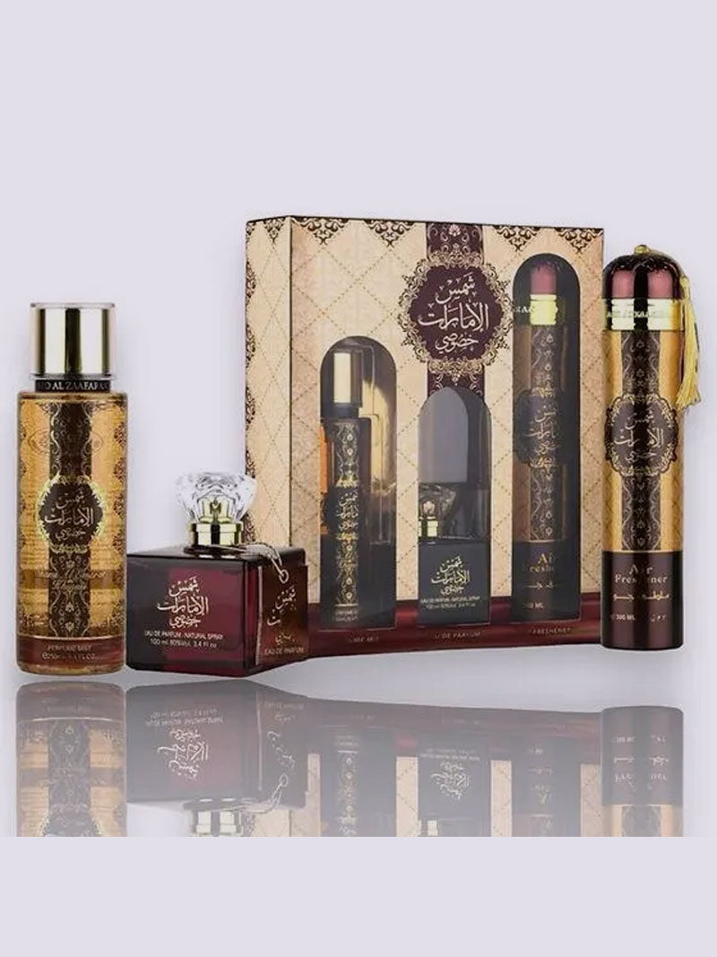 This exquisite set features three carefully curated fragrance items that capture the essence of luxury and elegance. Each item is crafted to provide a unique scent experience, perfect for both personal enjoyment and gifting. Ideal for any occasion, this collection allows you to indulge in the richness of Arabian perfumery and make a statement with its captivating fragrances.