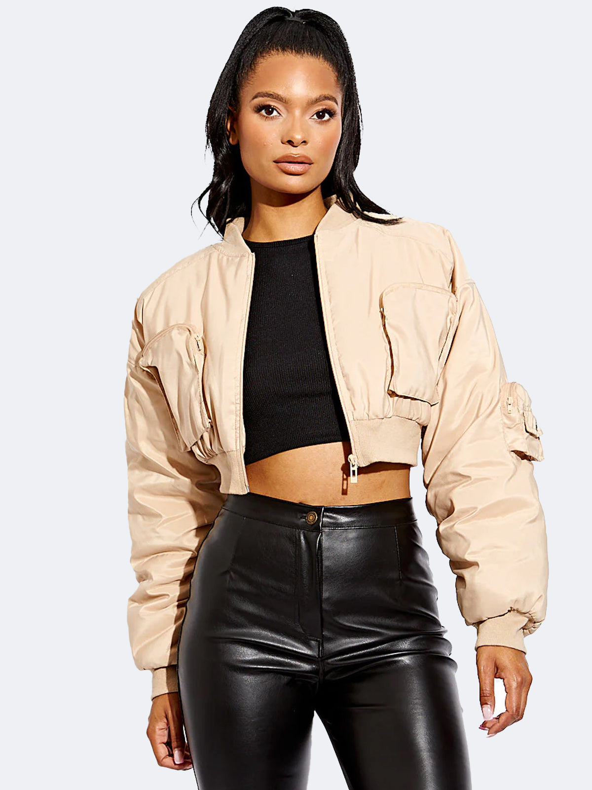 This fabulous bomber jacket features ruched sleeves, functional utility pockets, and a cropped design for a trendy and stylish look. With a convenient zip pocket on the left sleeve and a zipper fastening, it's both functional and fashionable. Made of 100% polyester, this jacket is a must-have for any fashion-forward woman. Approximate length is 14 inches or 35 centimetres.