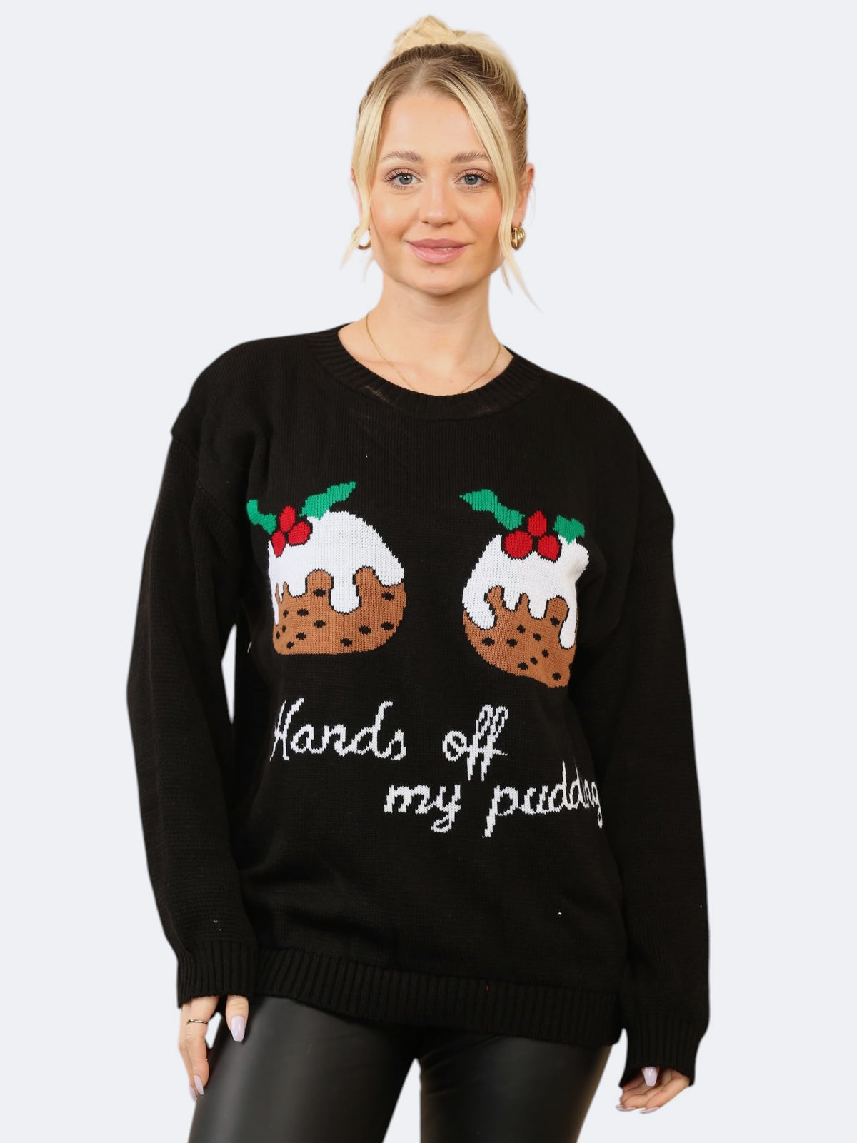 Women's Knitted Xmas Hands Off My Puddings Christmas Jumper